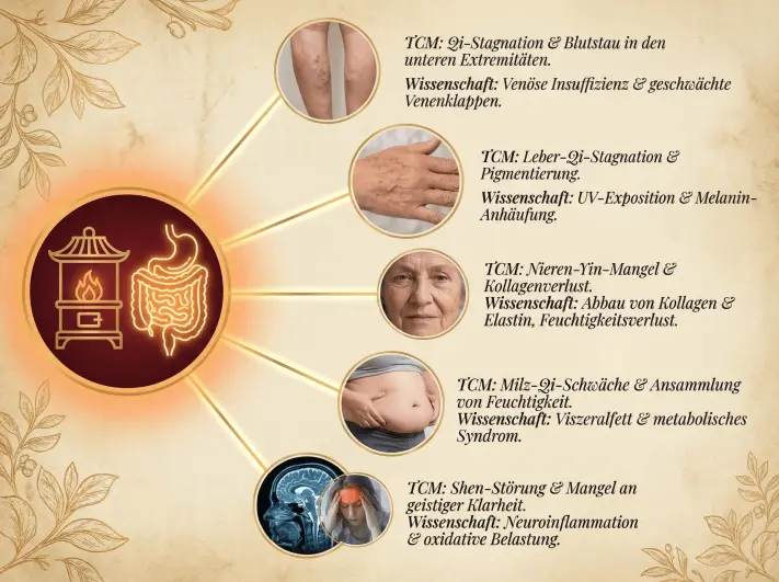 + Ich dachte, das wäre für die Darmgesundheit. Wie hilft es meinen Venen/Haut/Energie?In der chinesischen Medizin ist der Darm der "Ofen", der alles antreibt. Die moderne Wissenschaft bestätigt dies: Darmentzündungen beeinflussen die Durchblutung (Venen), das Hautbild, den Stoffwechsel (Bauchfett) und die Gehirnfunktion (Energie/Nebel). Reparieren Sie den Darm, und der ganze Körper profitiert.