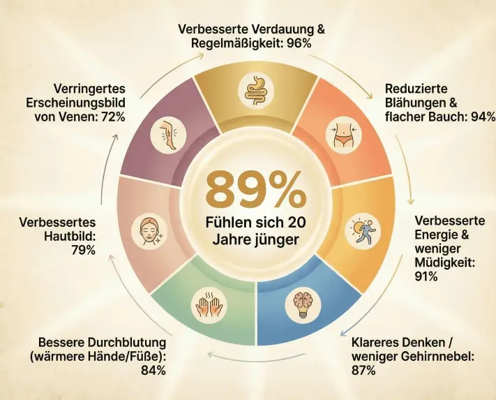 + Wie schnell werde ich Ergebnisse sehen?Die meisten Menschen bemerken eine Verbesserung der Verdauung innerhalb von 3-7 Tagen. Energie und geistige Klarheit verbessern sich typischerweise bis Woche 2. Sichtbare Veränderungen (Haut, Venen, Bauch) erscheinen normalerweise zwischen Woche 4-8. Für maximale Ergebnisse verpflichten Sie sich zu 60 Tagen.