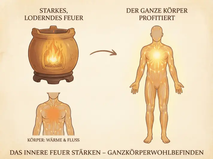 Der Ofen hält Ihr Blut warm, in Bewegung und stark. Er treibt Ihre Durchblutung an. Er nährt Ihre Haut. Er verbrennt das Fett. Er liefert Ihre Energie.