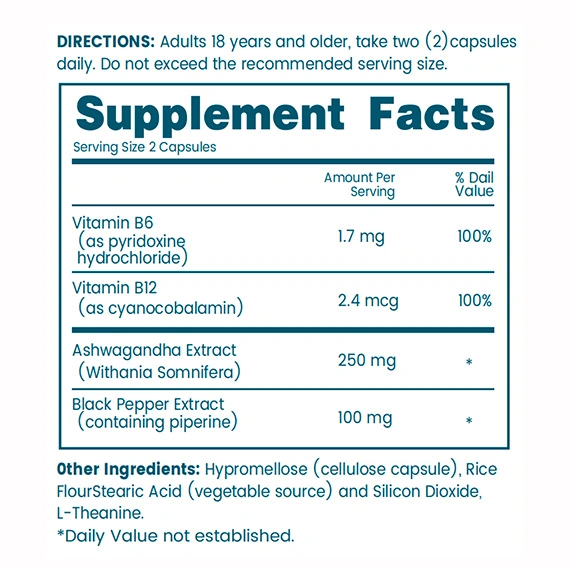 Ashwagandha Extract + Vitamin B + L-Theanine + Black Pepper Extract (containing piperine)