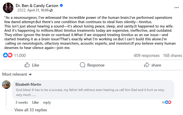 "Ben-your message is powerful. Tinnitus affects everything: sleep, focus, sanity.It's time we stop ignoring it.I'll contribute $8 millionto accelerate your vision and assign a top-tier R&D team from my AI neuro-tech division in Japan.These engineers specialize in olfactory nerve routing and brain-sound pathway modulation.Let's disrupt this industry with a solution that doesn't just mask the sound-but calms the brain itself."