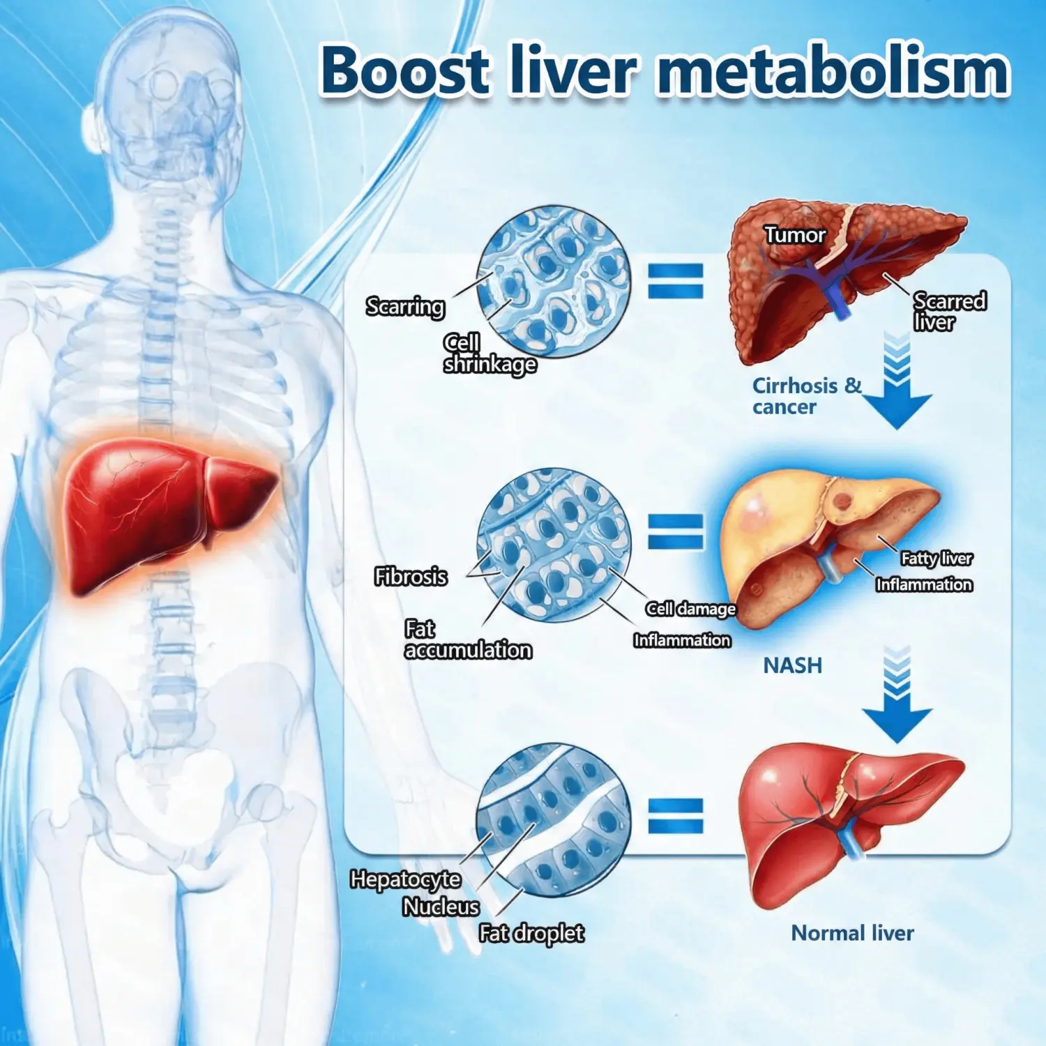 Fatty liver: Can lead to fatty liver disease, which may progress to liver dysfunction, cirrhosis, or require liver transplant.
