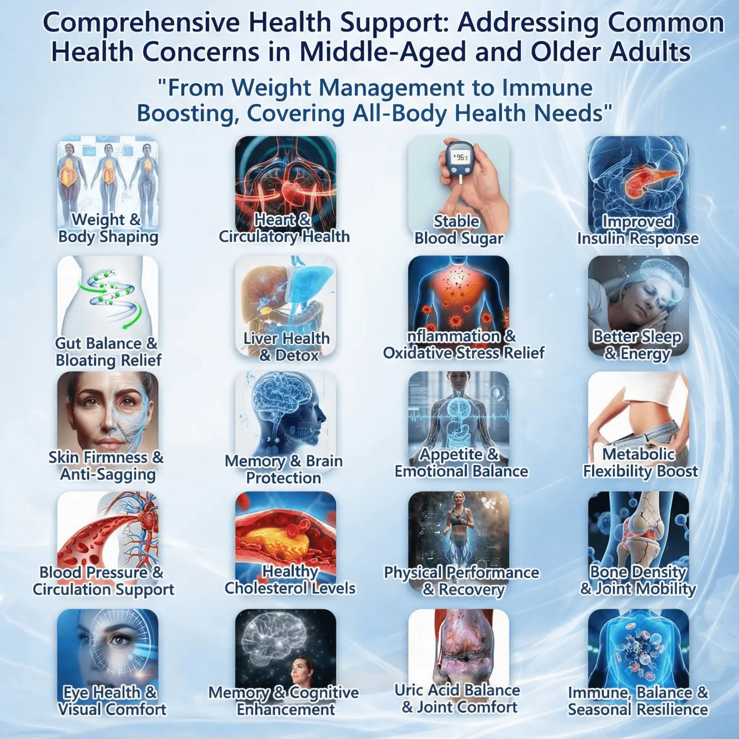 Benefits: Supports effective weight reduction and appetite regulation, stabilizes blood glucose levels, promotes cardiovascular health, reduces chronic low-grade inflammation, and helps alleviate metabolism-related fatigue.