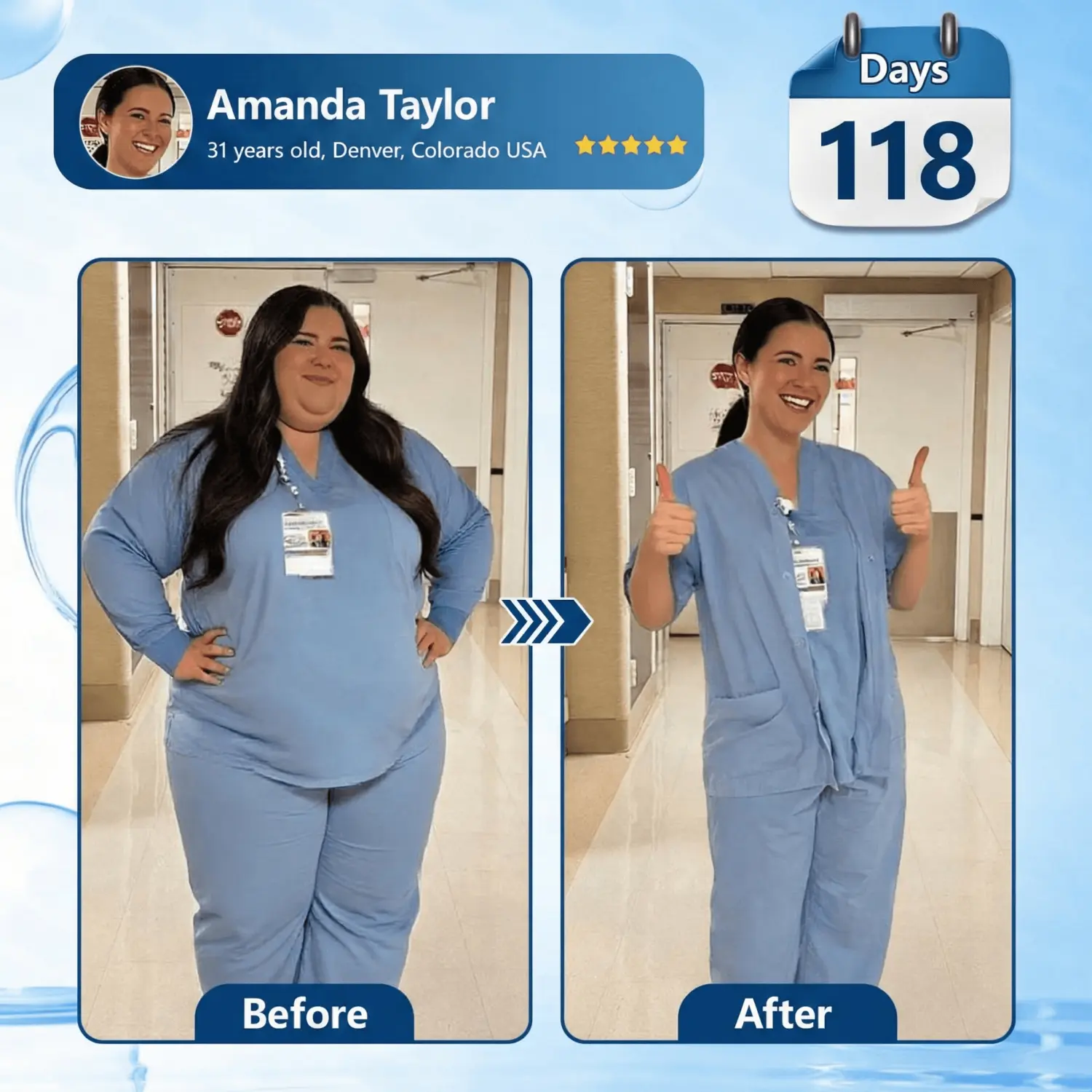By month two, my energy was back. Started evening walks again. Four months later-170 pounds gone, down to 117. My skin didn't get all saggy and loose like you'd expect from such rapid weight loss. I'm actually pretty satisfied with how tight everything stayed. I'm still nursing, but now I take care of myself too. I tell my patients struggling with weight: it's never too late to get your health back." - Amanda Taylor, 31, Denver, Colorado